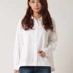 冬でも着て頂きやすい様に、程よく厚みのある起毛素材を選びました。今回のスタイリングは抜き襟の様に着て頂き、後ろ部分にボリューム感が出る様な着こなしをしていますが、カーデなどを羽織っても着て頂ける、ビックシャツにしてあります。裾にあるステッチもふんわりとしたボリュームを出す為には欠かせないディテールです。